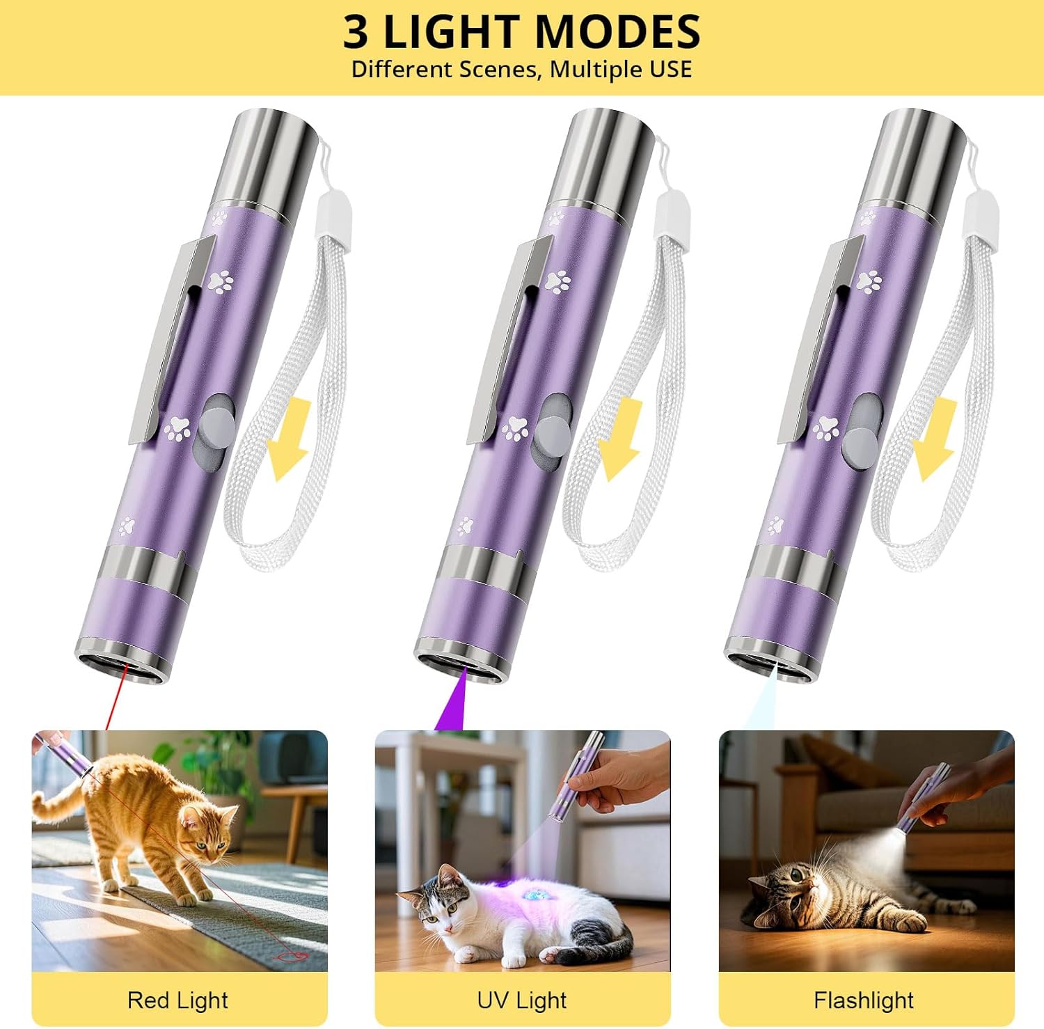Multi-Functional & Versatile: Not just a pet toy, this red light pointer cat toy doubles as a presentation pointer with a bright, clear beam. Press the button once to activate—no need to hold it down. It also includes a glow-in-the-dark mode and a purple light mode, perfect for detecting counterfeit money or adding fun to your presentations.