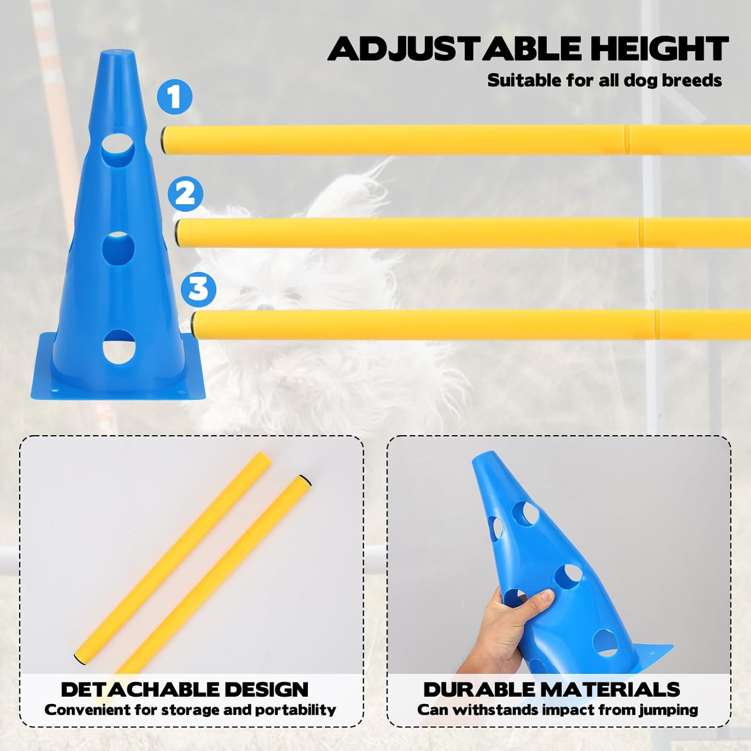 Flexible and adjustable: You can adjust the obstacles to three different heights. The obstacles can be flexibly adjusted according to the size, age and training goals of your dog or child.