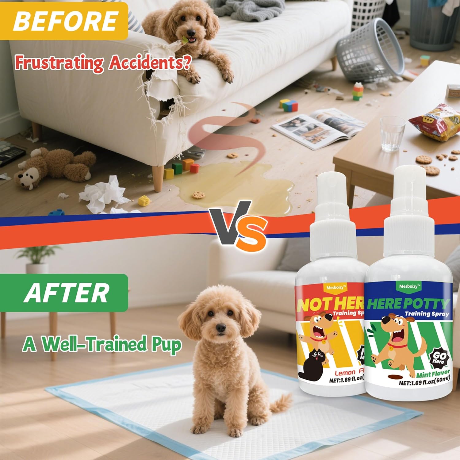 This spray set is really helpful and works better than I expected, the “Here Potty” spray makes my dog understand where to go, and the “Not Here” spray keeps him away from furniture and rugs, which is a huge relief, using both sprays together makes training faster and less stressful, and my dog seems to get it after a few tries, the sprays are easy to use and fit nicely in my hand, so I can quickly spray the right spots without making a mess, the scents are gentle and not overwhelming, but they seem to catch my dog’s attention just enough to guide him, I have tried it on training pads, rugs, and outside areas, and it works consistently, the bottles are small but sturdy and should last through many uses, the instructions are simple and easy to follow, and it does not take much effort to repeat the process until habits form, for the price, this set is excellent value because it combines both training functions in one kit and actually helps save time and frustration during potty training, it is gentle, safe, and easy to use, and overall it makes training my dog much more manageable and even a little fun, so I feel confident recommending it to anyone trying to teach their pet good bathroom habits.