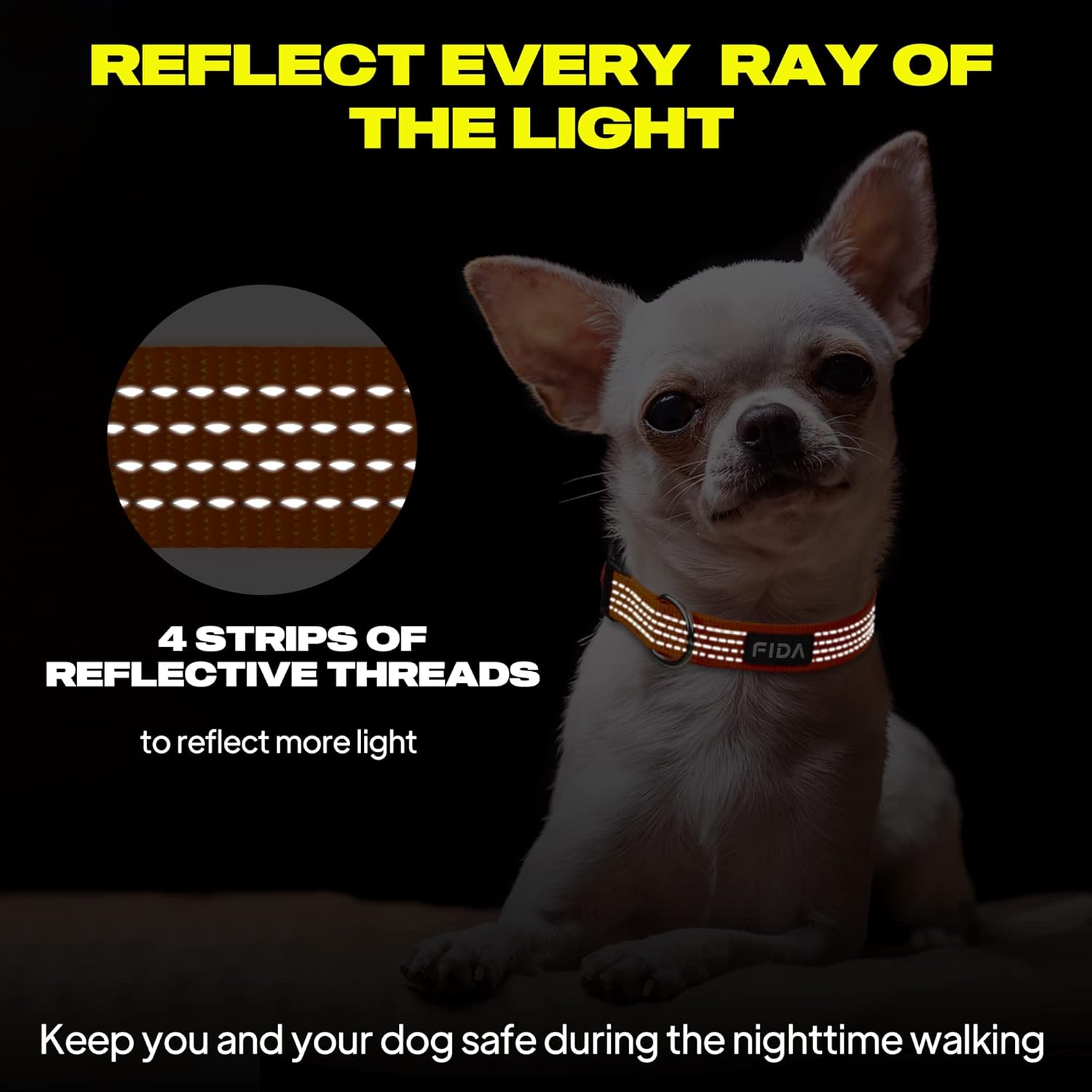 ✅【HIGH VISIBILITY REFLECTIVE STITCHING】 FIDA reflective dog collar has extra four lines of 2mm wide reflective stitching that is interwoven right in the webbing. This gives the collar a large amount of reflective surface area compared to other collars, keeping you and your dog safe during nighttime walking.