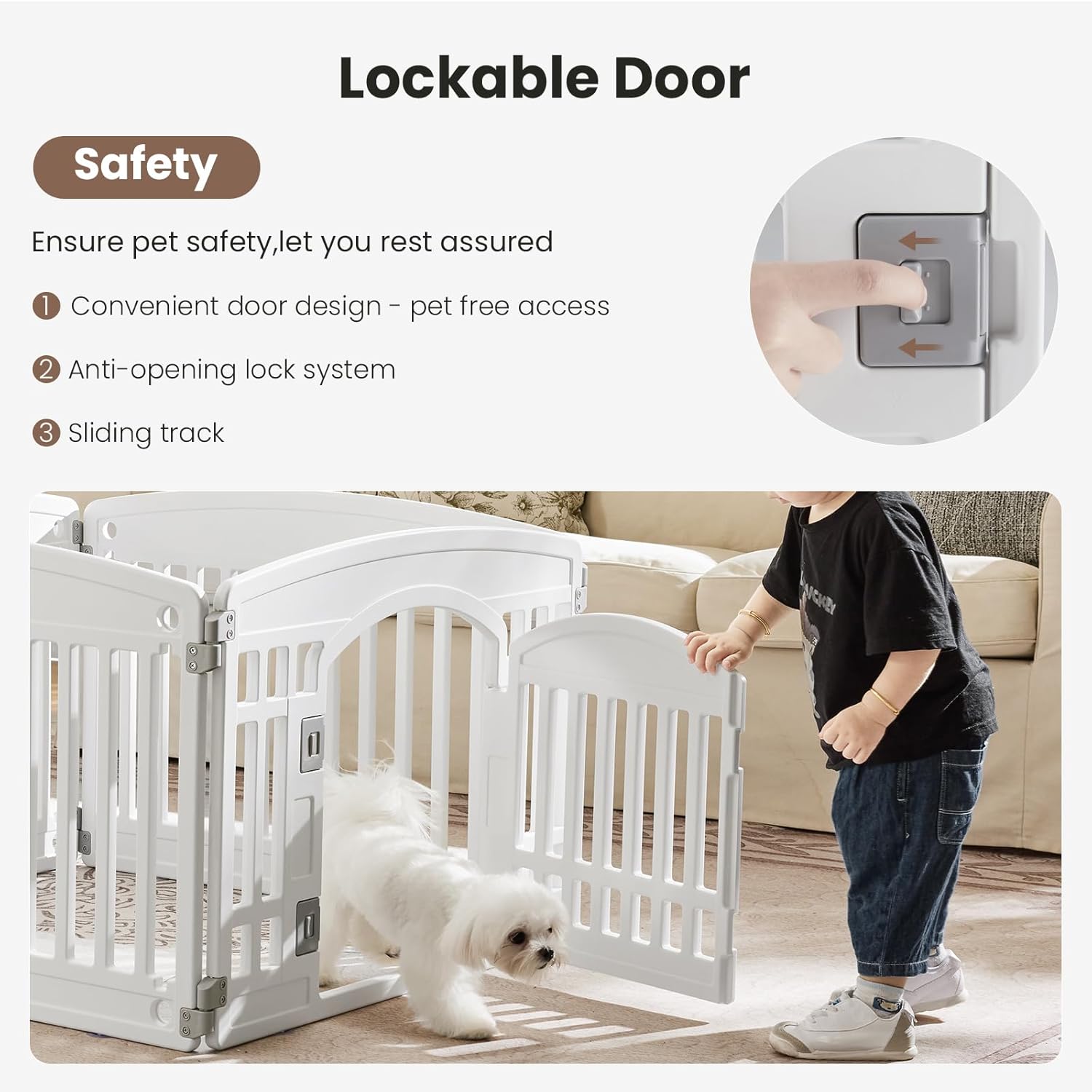 Enhanced Safety and Durability: Thoughtful features like a sliding lock mechanism ensure the gate remains pet-proof, while the small door design allows pets to exit freely without requiring lifting. The 4cm spacing between bars prevents pets from sticking their heads through, enhancing safety. Constructed using advanced blow molding technology, the playpen boasts thicker, sturdier panels that resist deformation, ensuring long-term stability and durability.