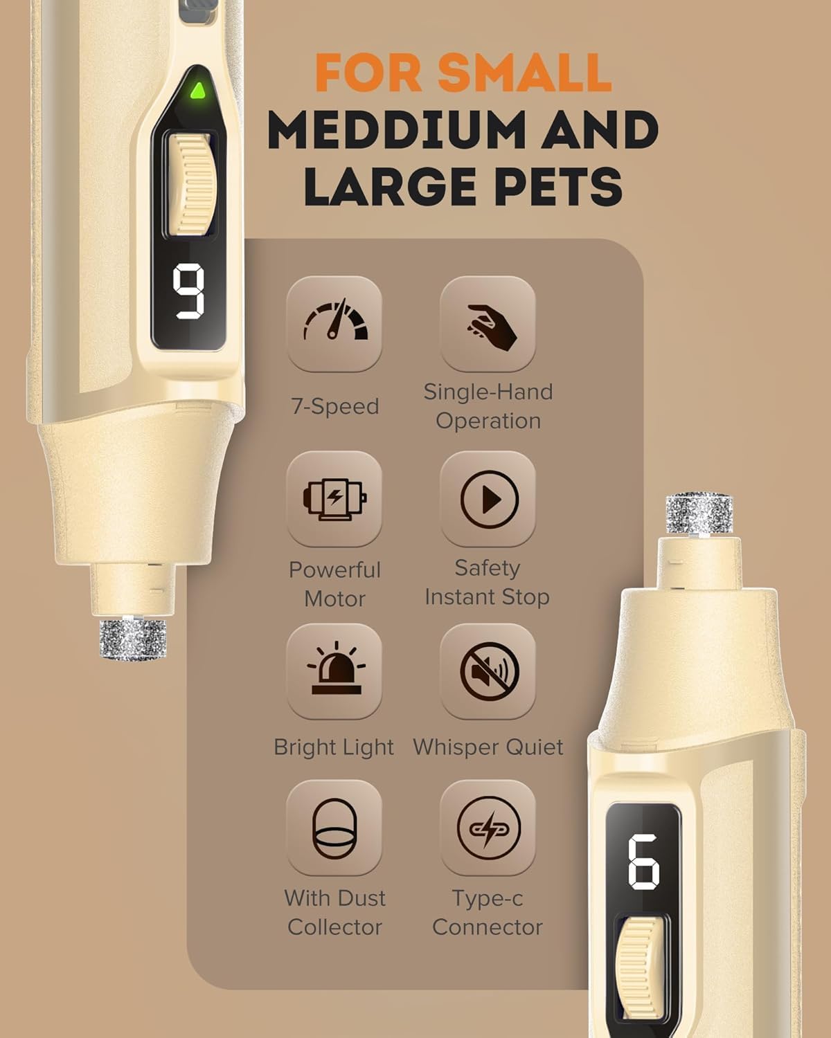 7 SPEEDS ADJUSTABLE: Ranging from 8,000 to 15,000 RPM, as one of the most powerful grinders, ideal for trimming the nails of small, medium, and large dogs, cats, birds, and other small animals